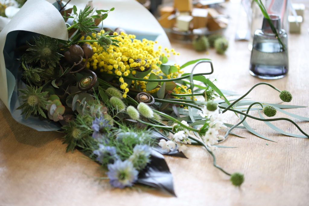 さて、古道具屋さんへのギフト装花の紹介。「古道具屋さんだからドライになっても楽しめる花材をプレゼントしたい」ということで、バンクシアとナンキンハゼの枝もの系花束と、ミモザやゼンマイなどのフレッシュ系花束を制作。ドライにしても表情が楽しめるものにしました😻